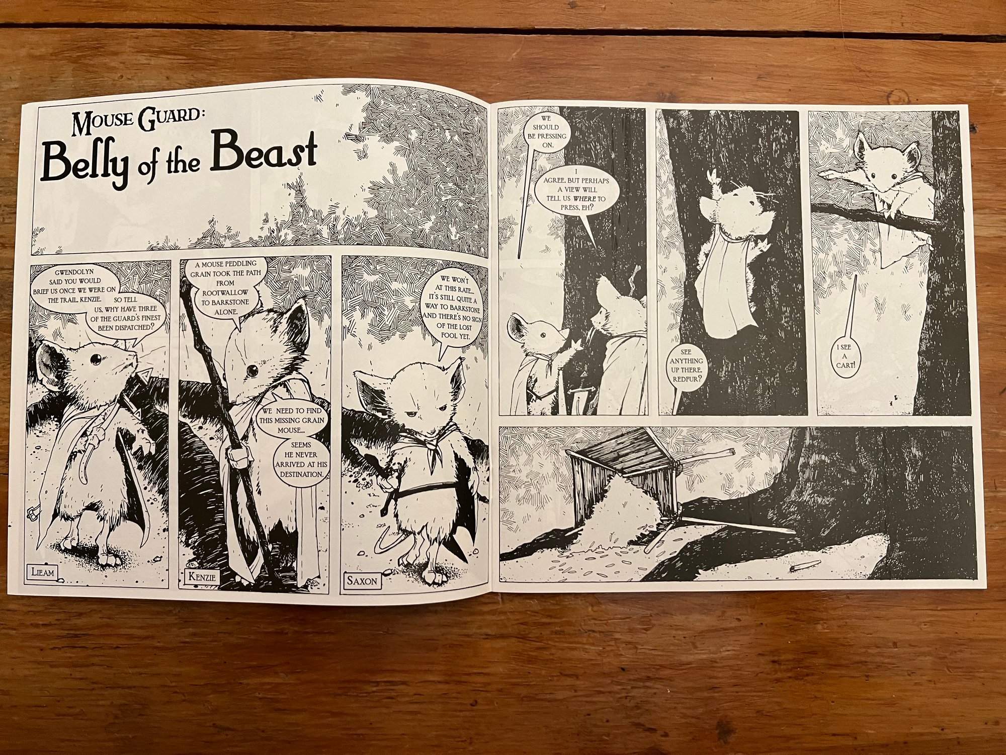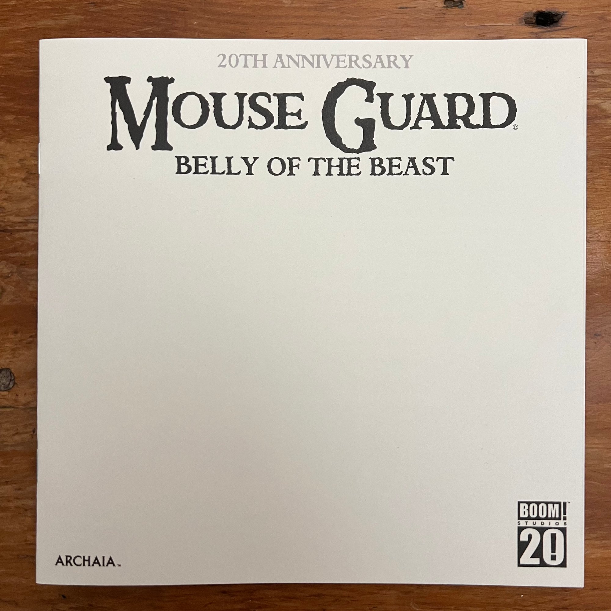 A facsimile reprint of the first issue of Mouse Guard with black & white interiors and a matte sketch cover to celebrate the 20th anniversary of the launch of the book.