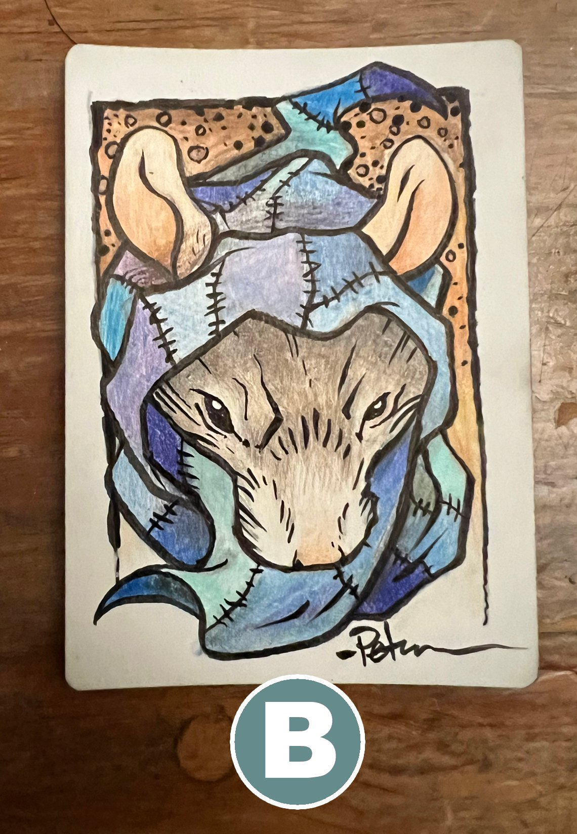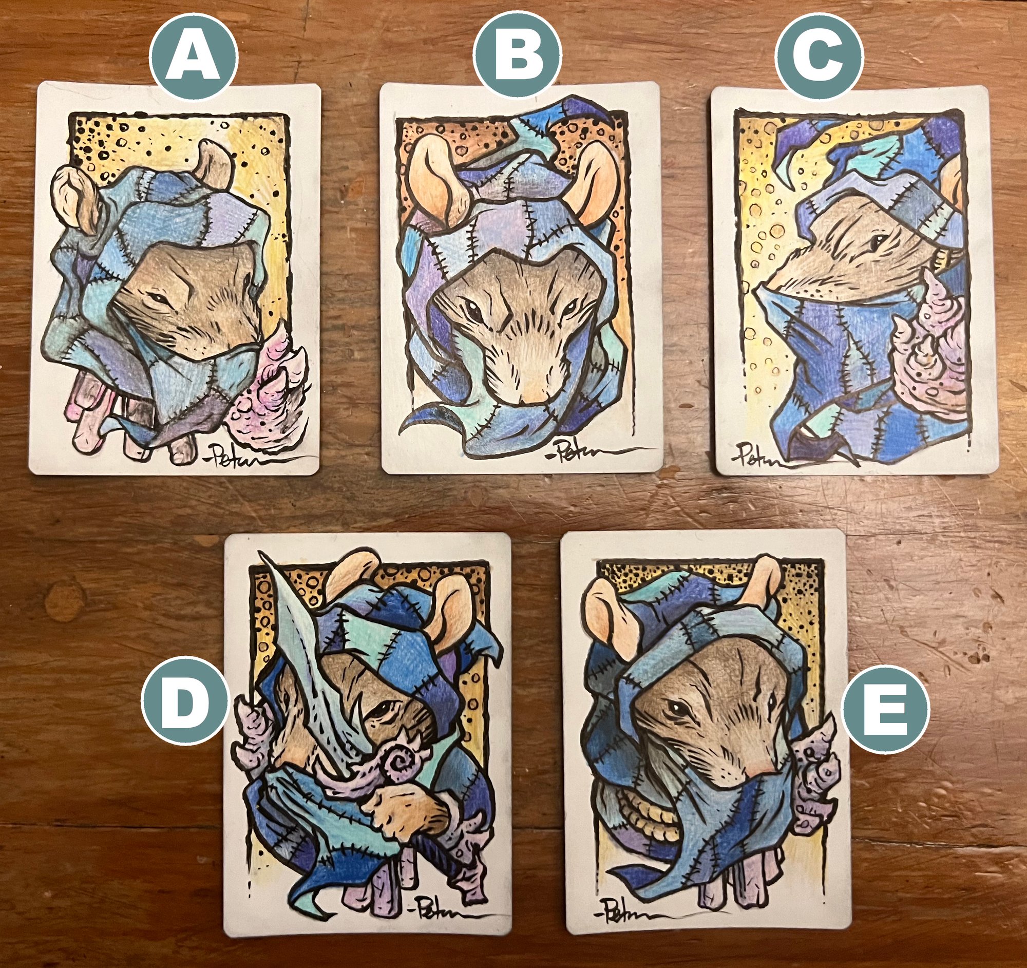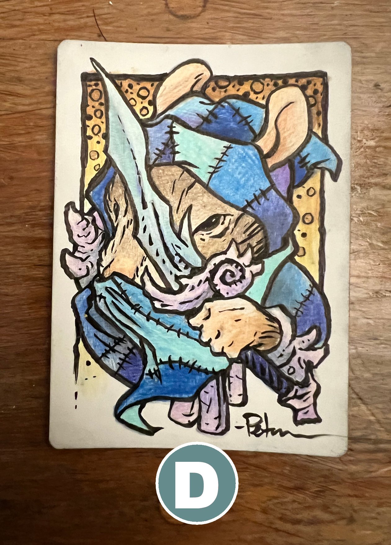 Each Card Proof is sold Separately. Art was done with Spectrum Design color pencils & Pigma brush pen. All cards come signed by David Petersen in the text box on the front.