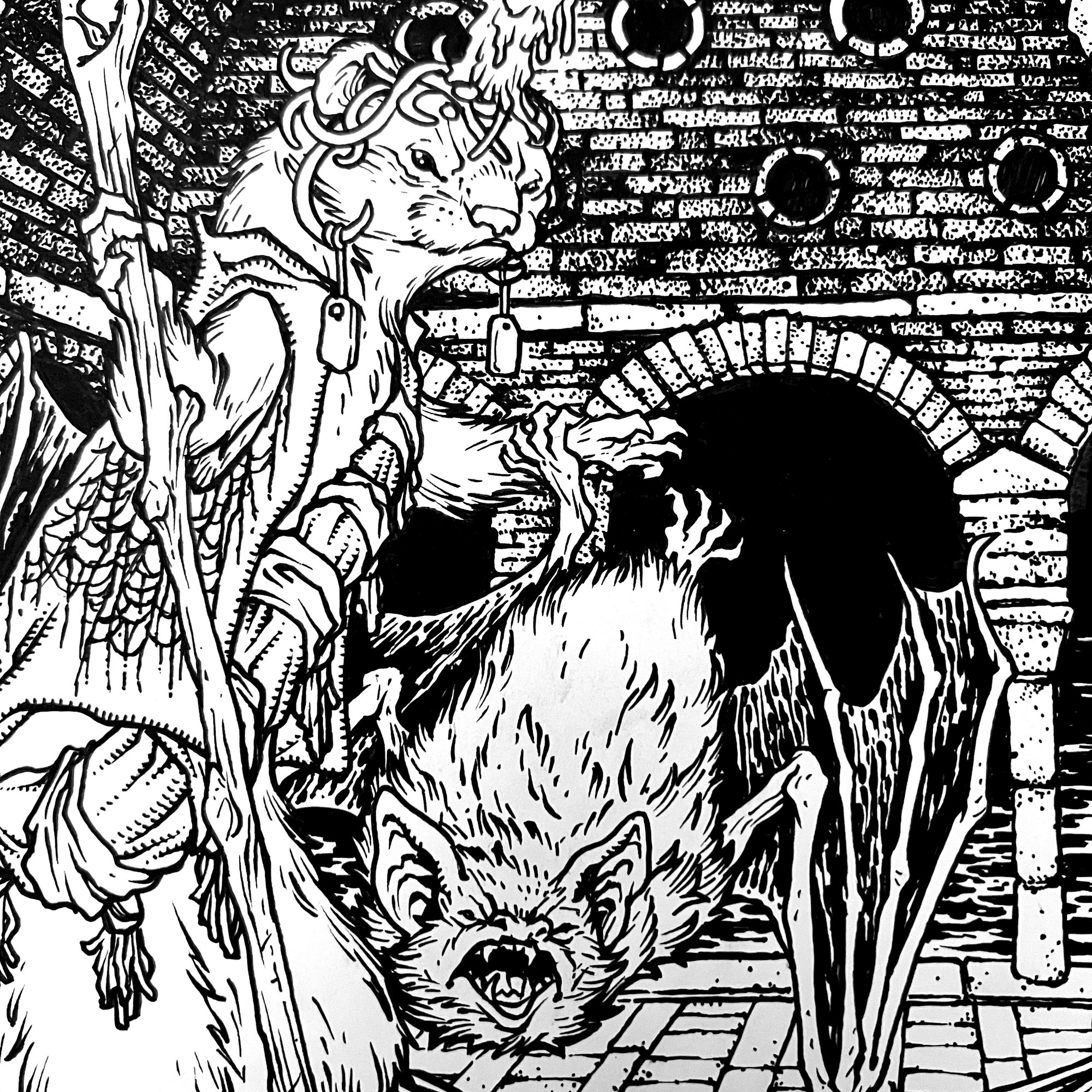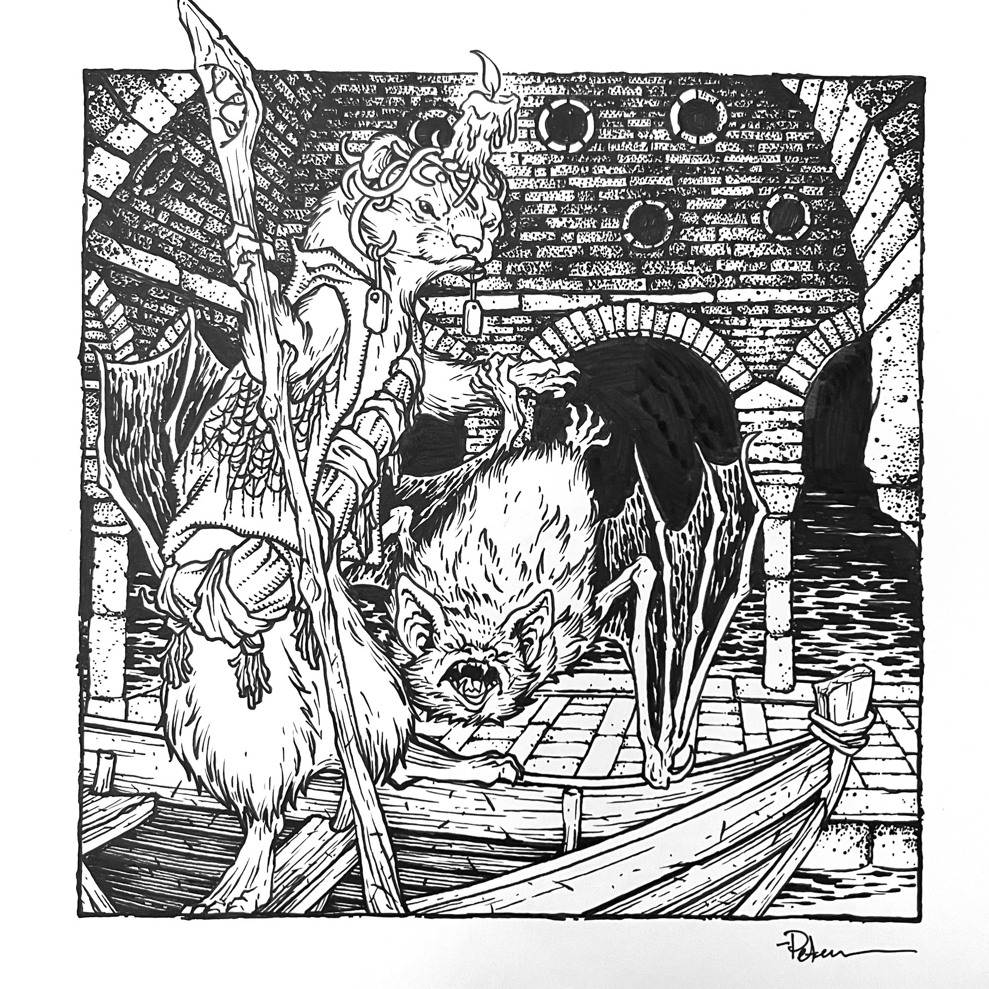 Inked original artwork of a Weasel and Bat in the bandoned tunnels of Darkheather to be used in an upcoming sketchbook.