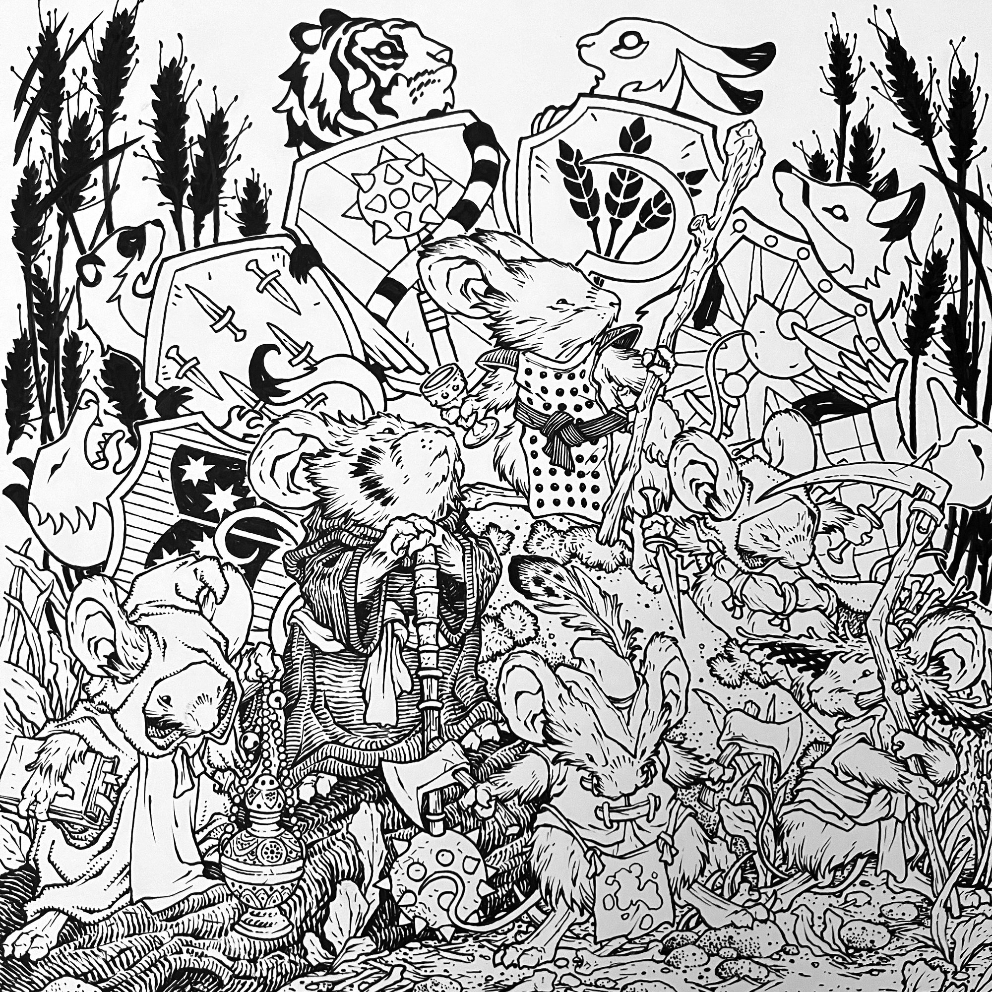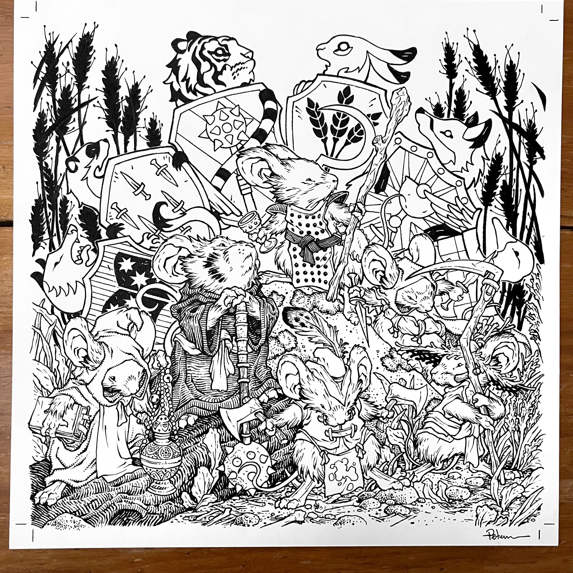 "Cover" art for a Mouse Guard short story titled 'Discordant Fellowship' currently available to view to paid Patreon members, and will be physically printed at a later date.