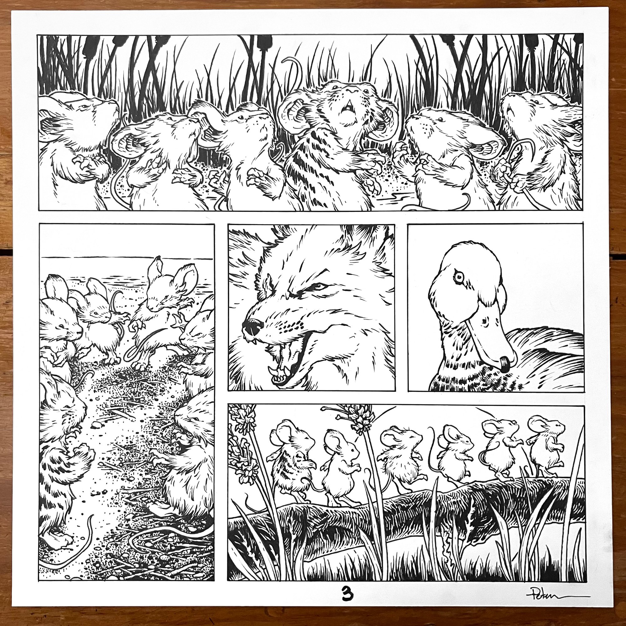 Page 3 art for a Mouse Guard short story titled 'Discordant Fellowship' currently available to view to paid Patreon members, and will be physically printed at a later date.