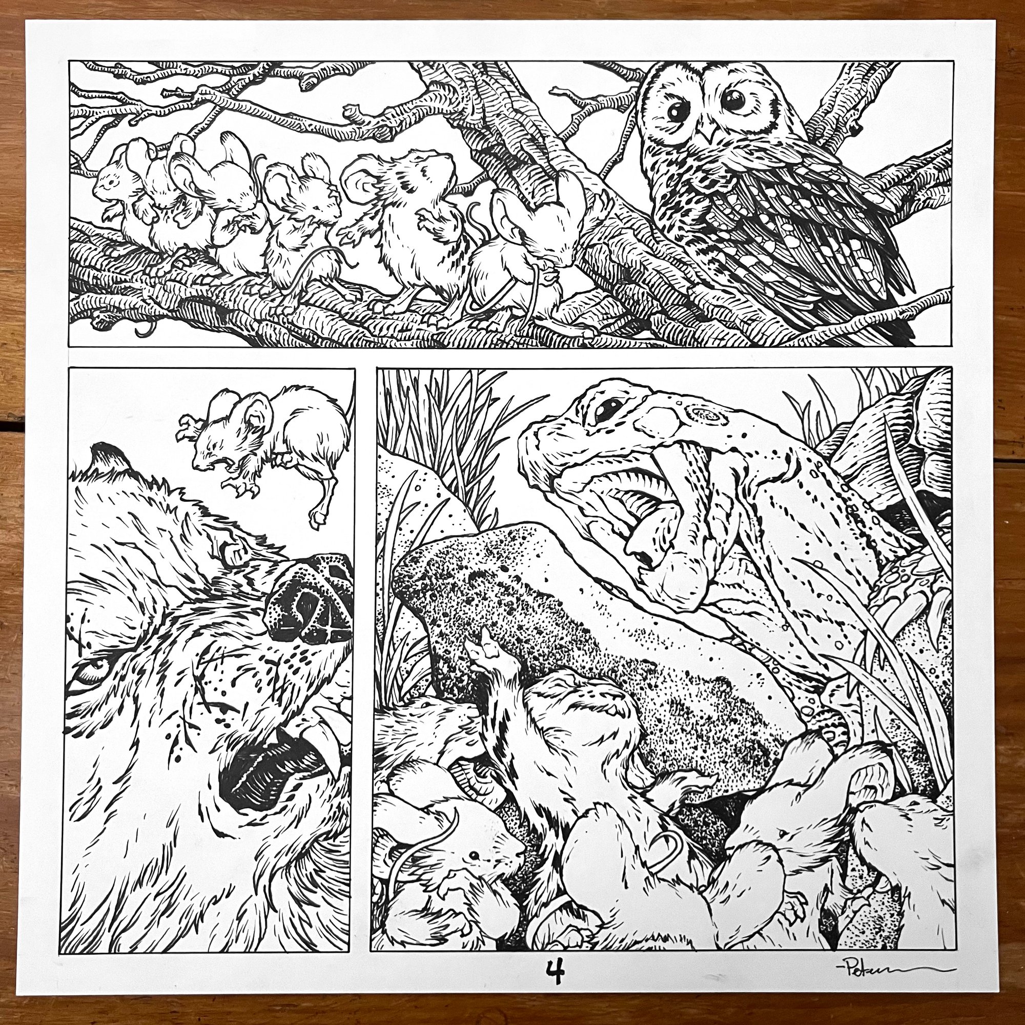 Page 4 art for a Mouse Guard short story titled 'Discordant Fellowship' currently available to view to paid Patreon members, and will be physically printed at a later date.