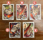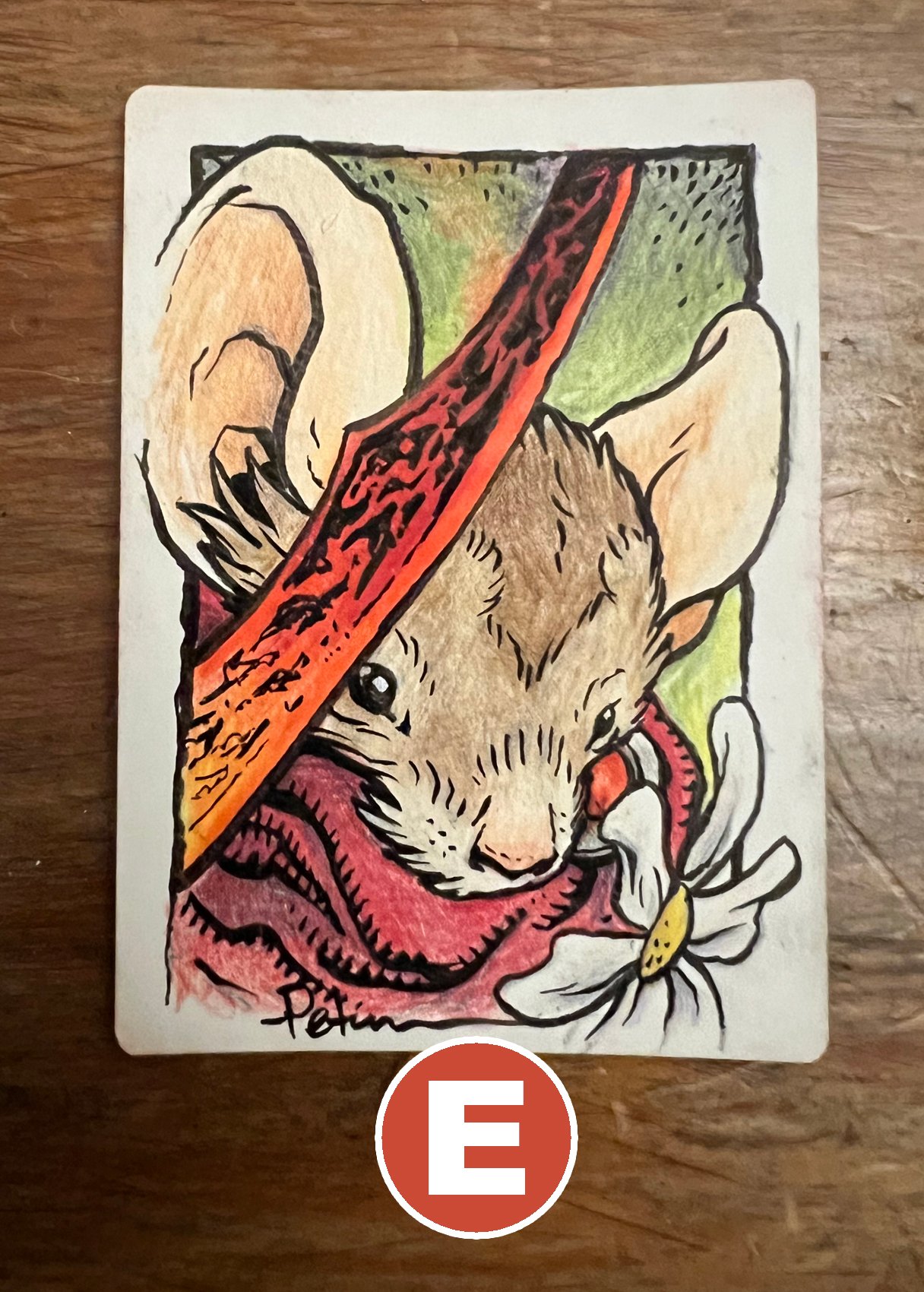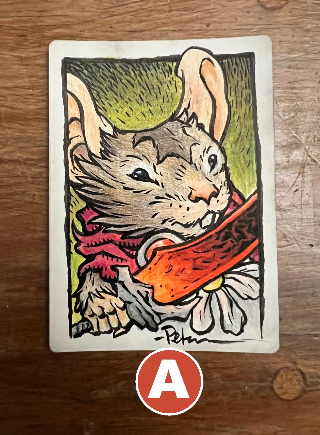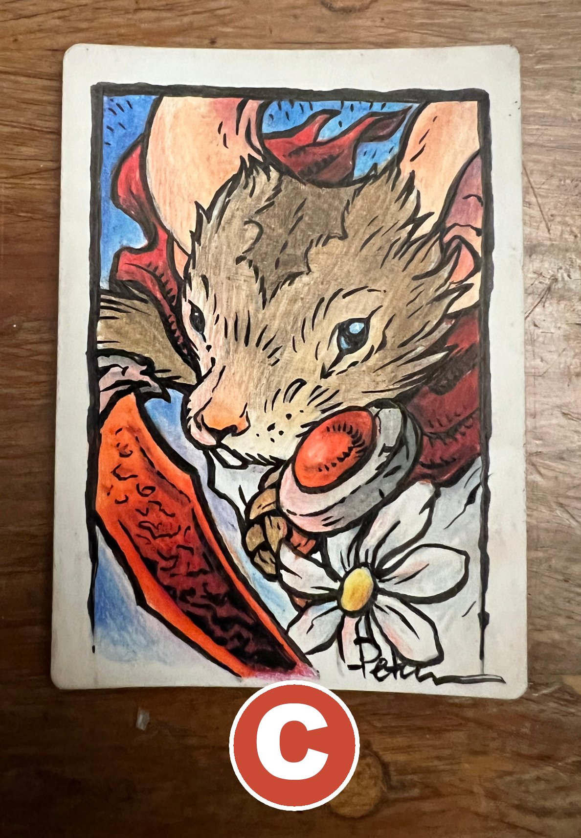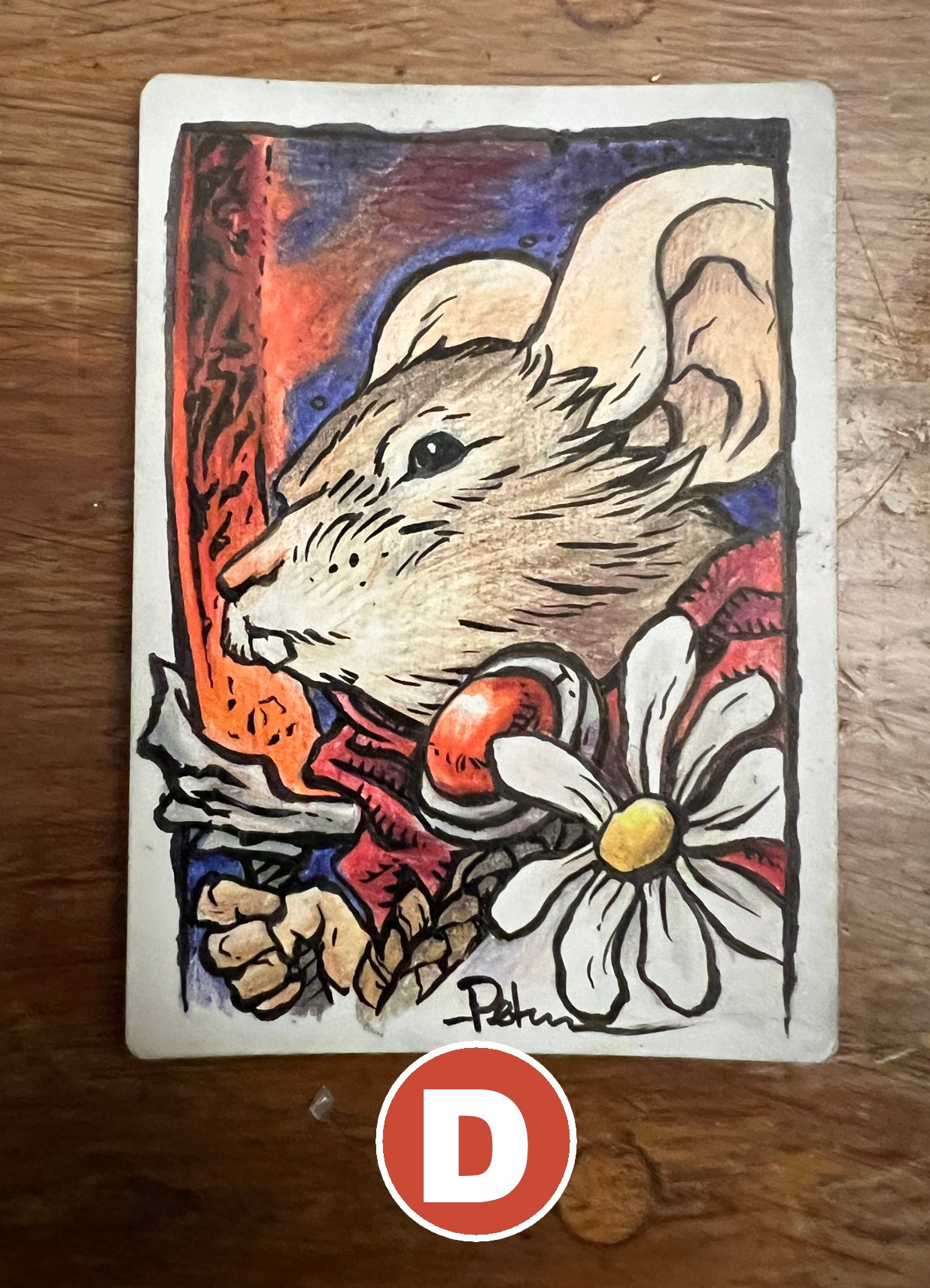 Each Card Proof is sold Separately. Art was done with Spectrum Design color pencils & Pigma brush pen. All cards come signed by David Petersen in the text box on the front.