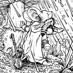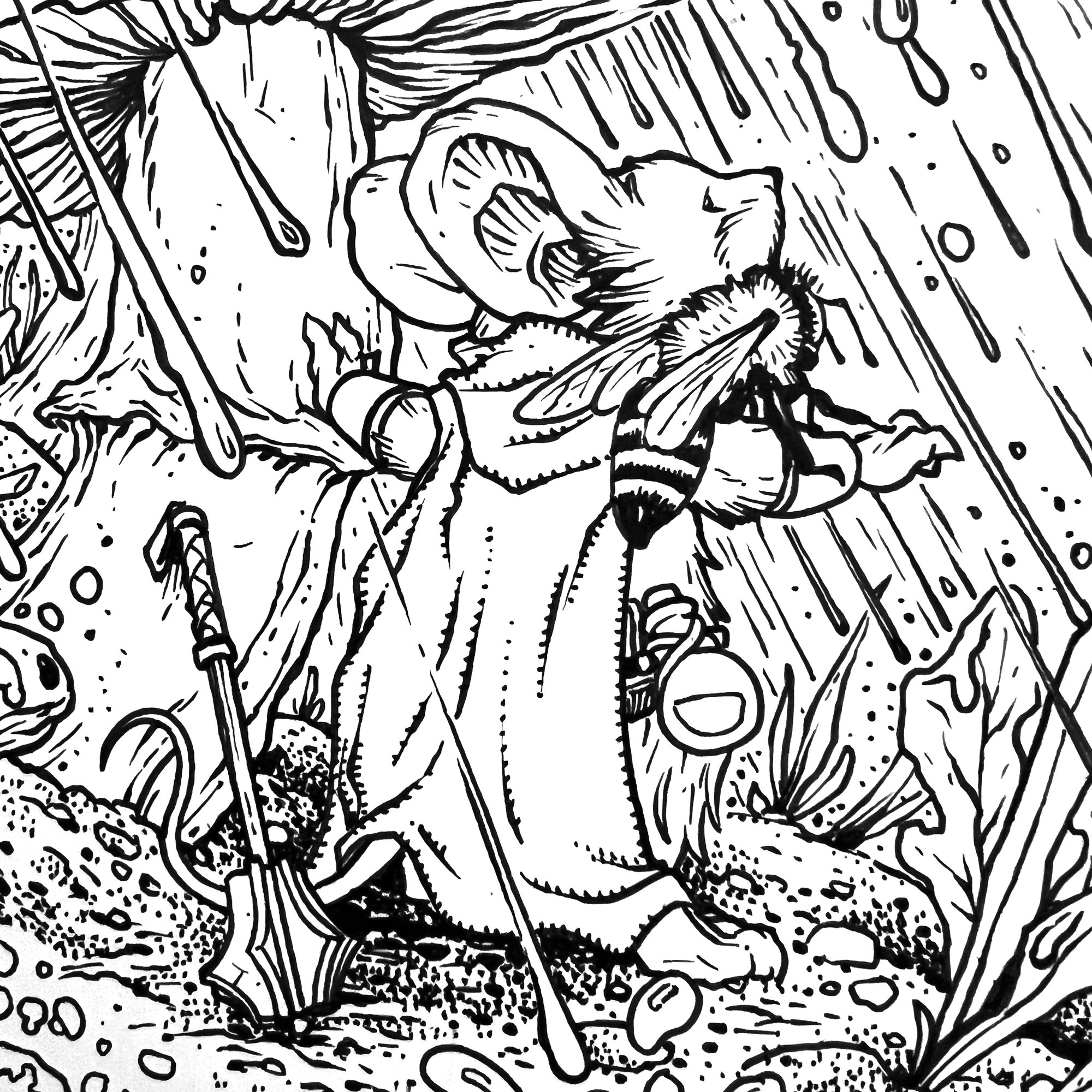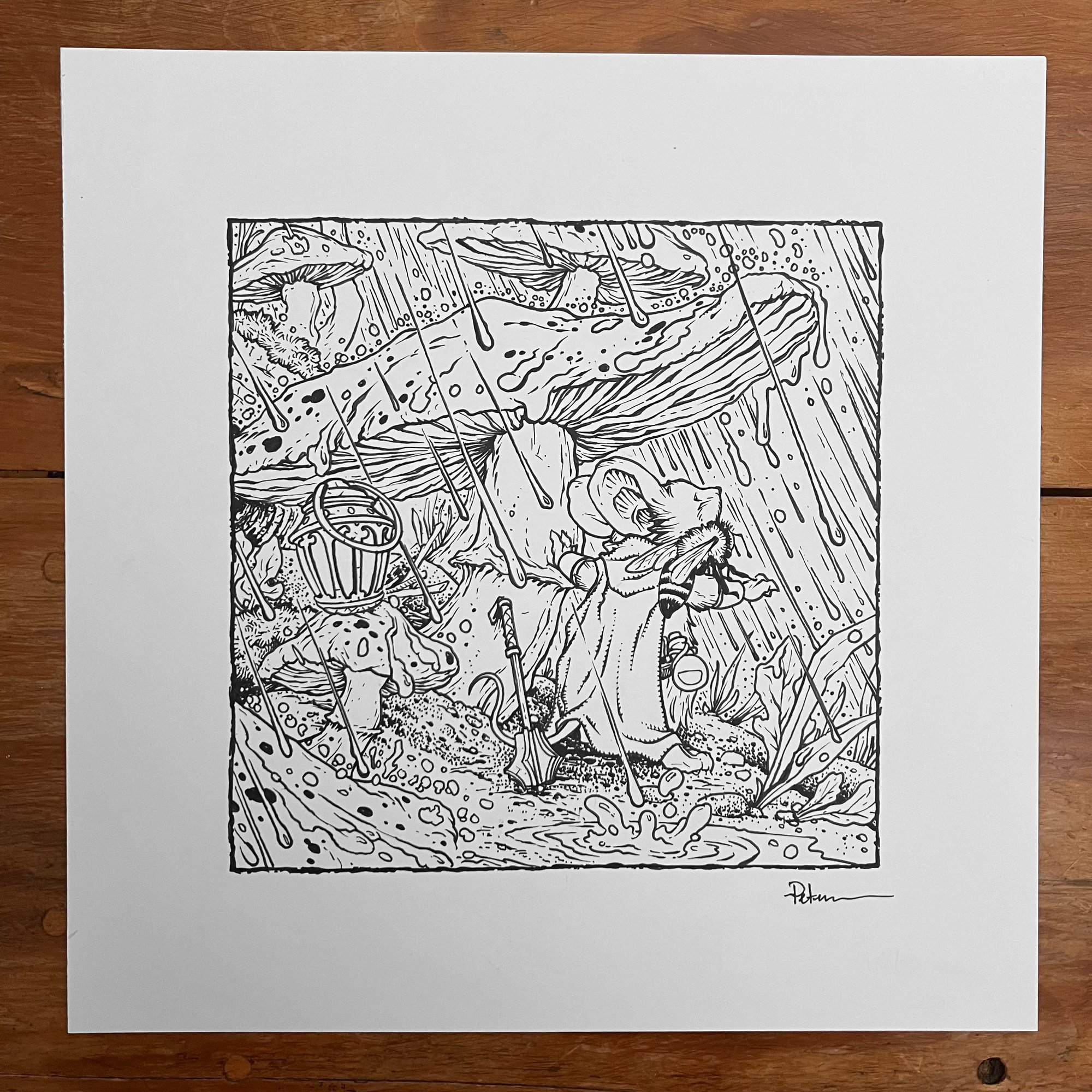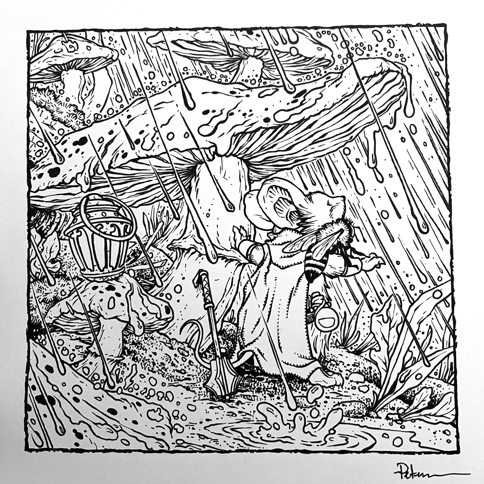 Inked original artwork of Sienna and a bee taking shelter under a mushroom in the rain to be used in an upcoming sketchbook.