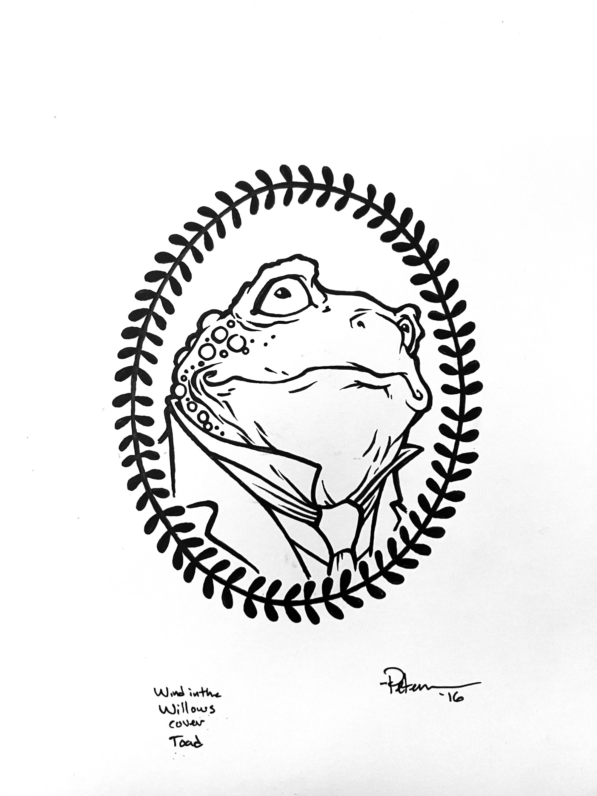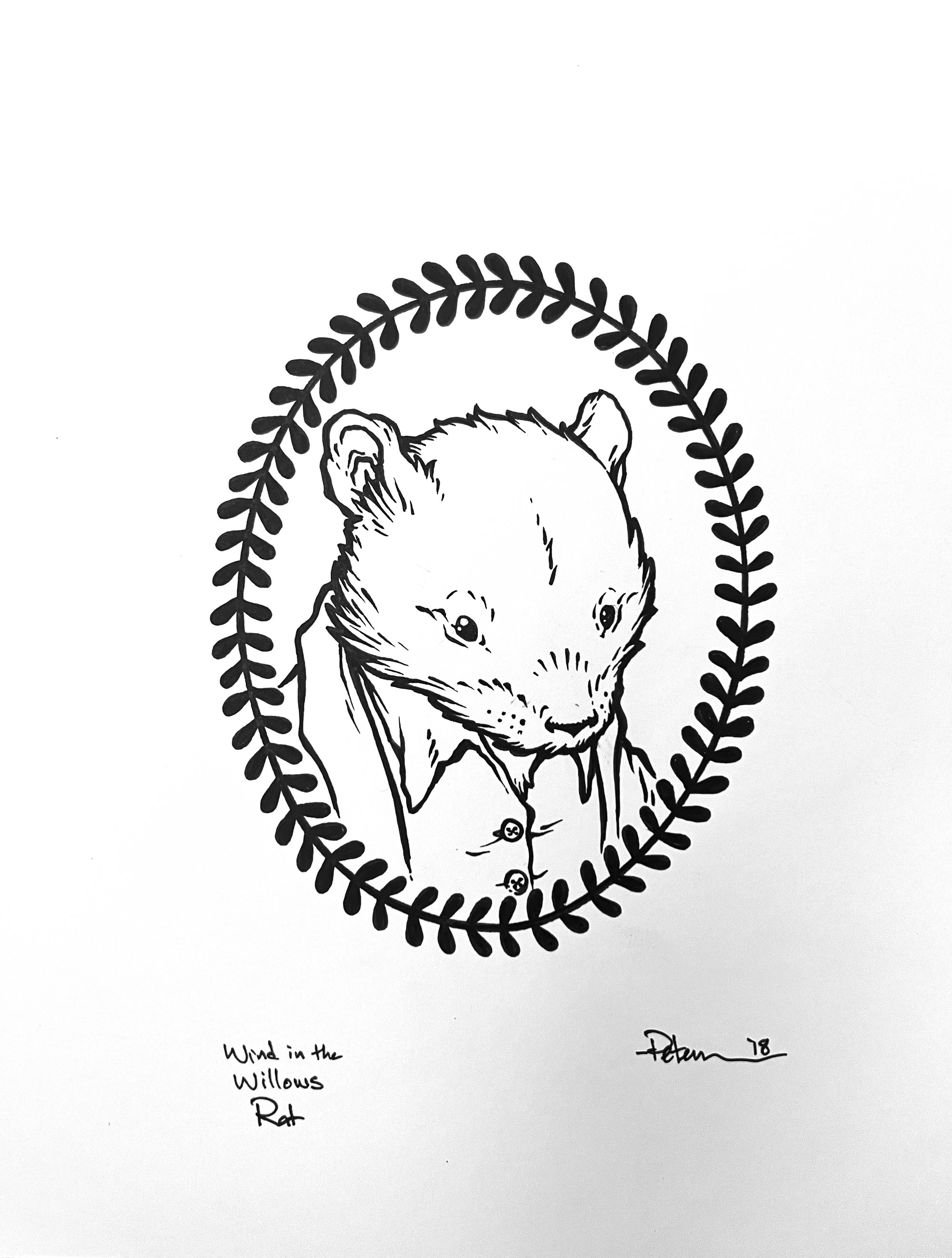 A set of portraits of Mole, Rat, Badger & Toad from Wind in the Willows illustrated by David Petersen. These served as preliminary study drawings for the new paperback cover
