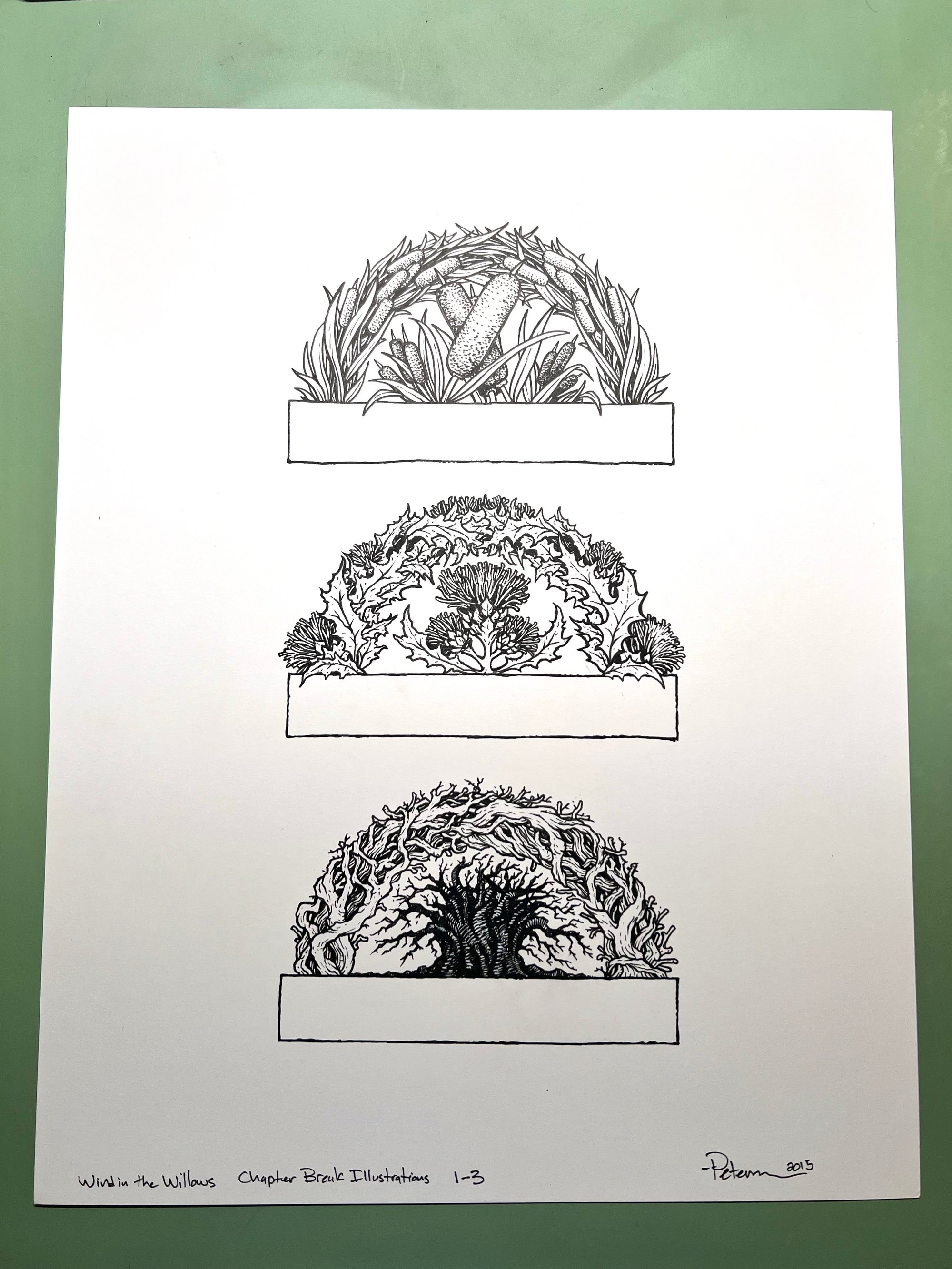Chapters 1-3 Chapter Header Illustrations with cattail, thistle, & Wild Wood motifs