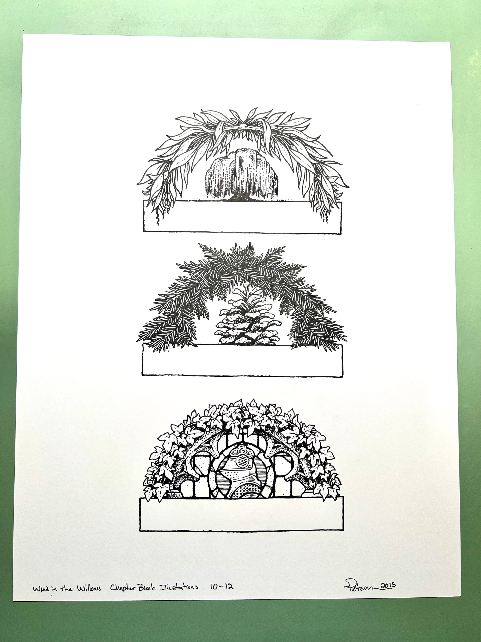 Chapters 10-12 Chapter Header Illustrations with willow, pine, & Toad Hall motifs