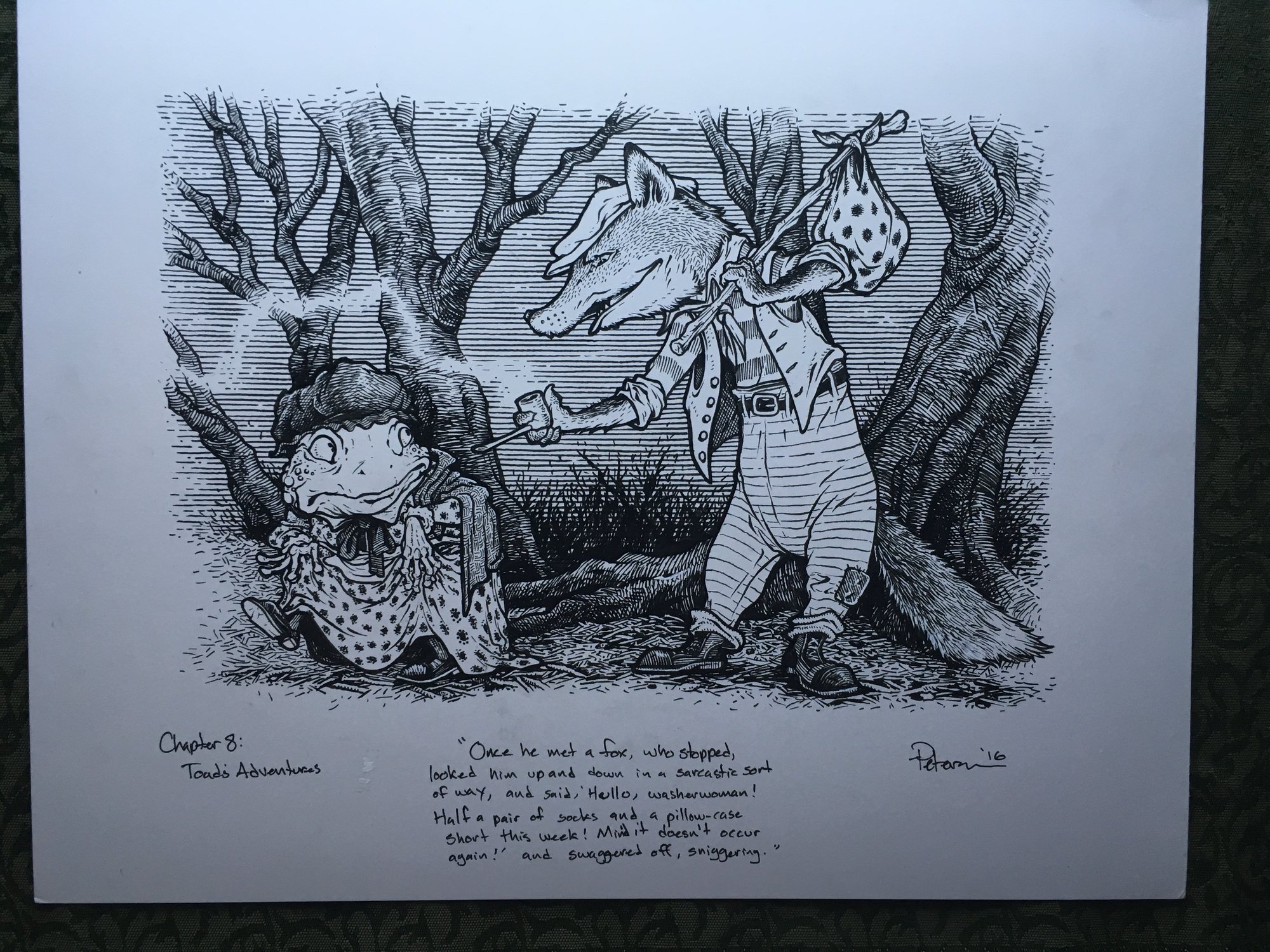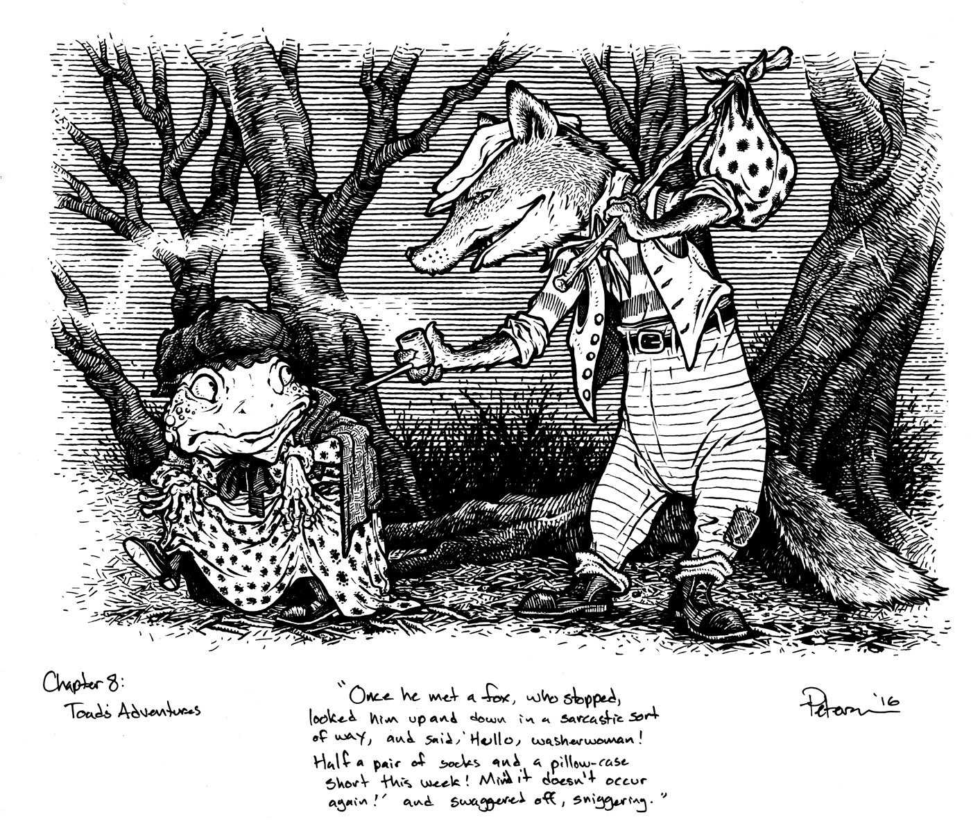 Chapter 8: Toad's Adventures "Once he met a fox, who stopped, looked him up and down in a sarcastic sort of way, and said, 'Hullo, washerwoman! Half a pair of socks and a pillow-case short this week! Mind it doesn't occur again!' and swaggered off, sniggering."