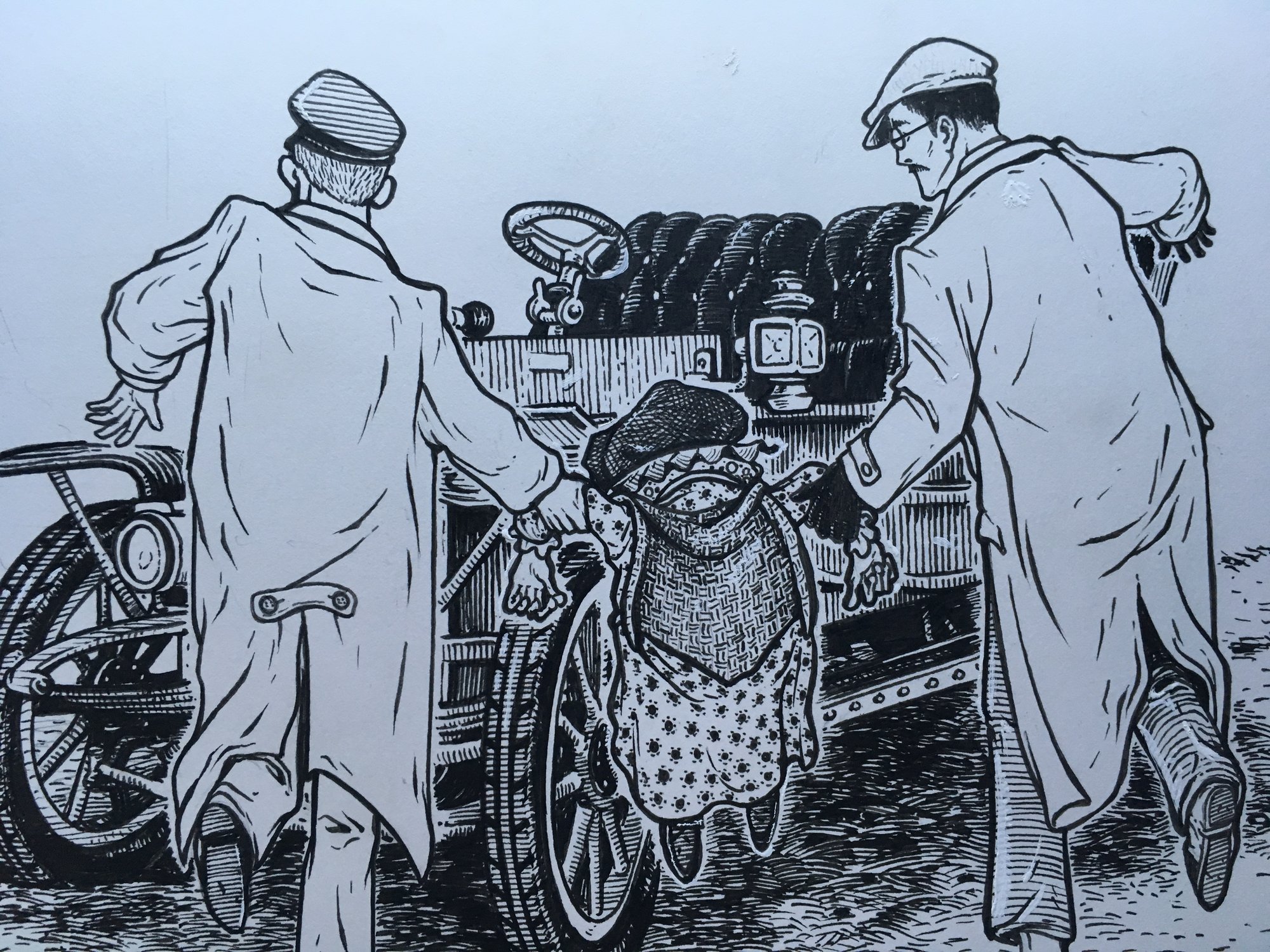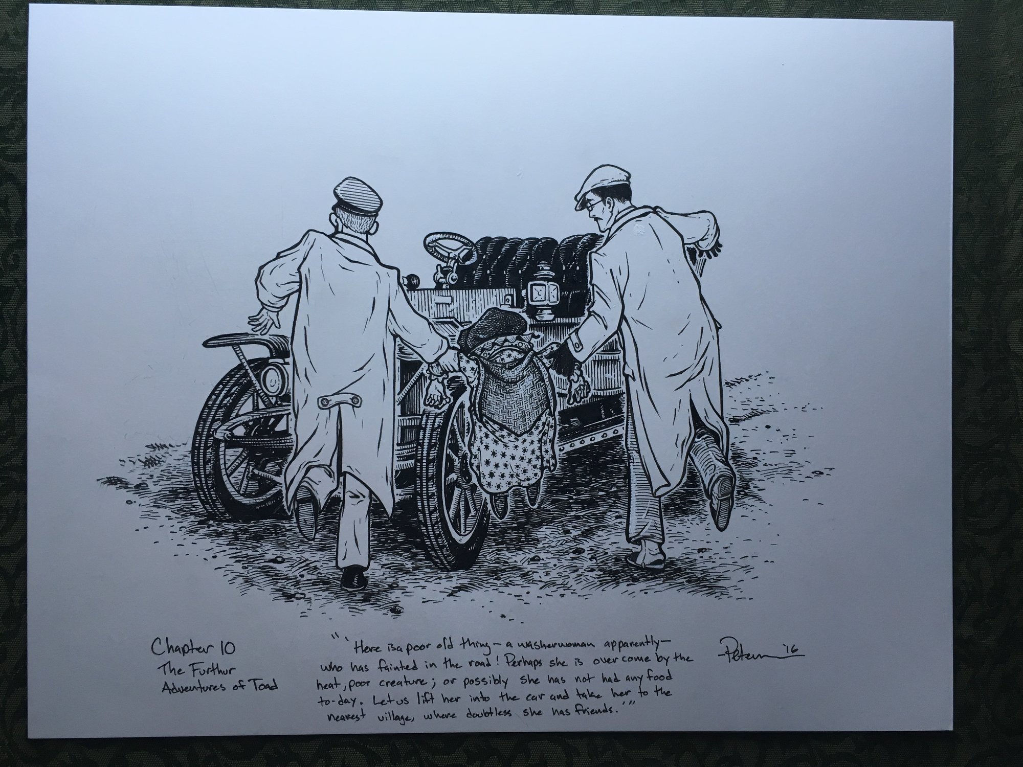 Chapter 10: The Further Adventures of Toad "Here is a poor old thing—a washerwoman apparently—who has fainted in the road! Perhaps she is overcome by the heat, poor creature; or possibly she has not had any food to-day."